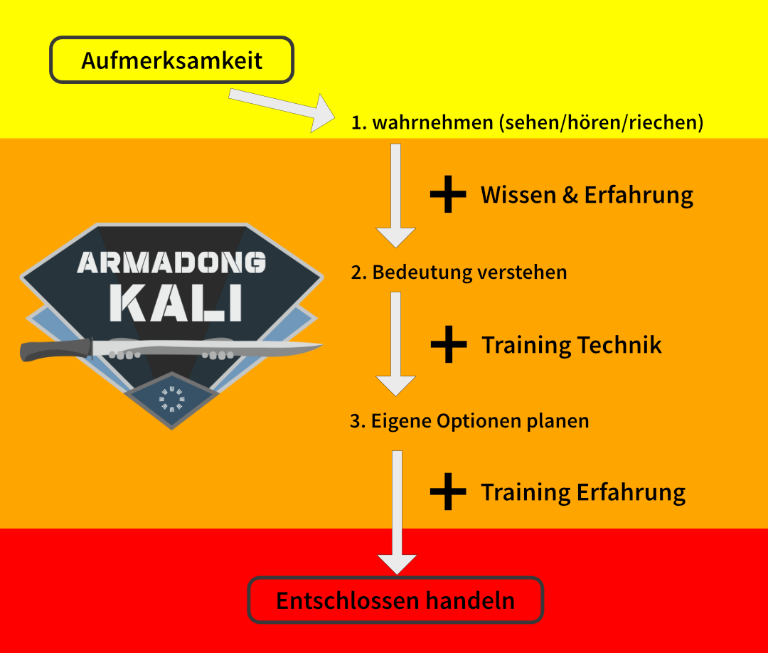 Im Armadong Kali arbeiten wir mit Default-Entscheidungen – sofort abrufbaren Standardreaktionen – sowie mit Situations-Drills und Loop-Drills. So entsteht Routine im Wechsel von Beobachtung, Reaktion und Entscheidung.